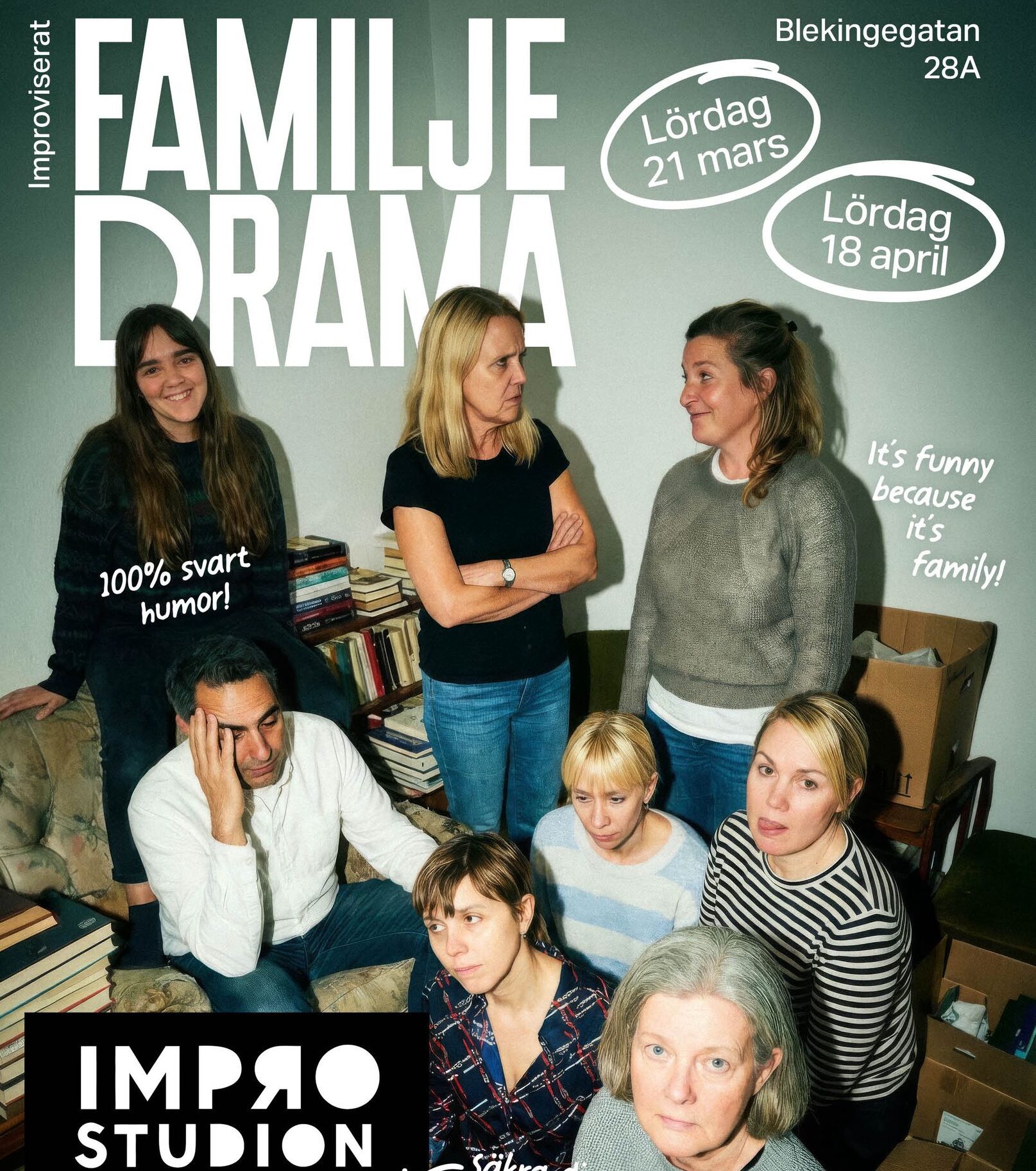 Familjedrama är en improviserad föreställning i tre akter, med fokus på relationsproblem, familjedynamik och karaktärer som känns obehagligt bekanta – personer vi har nära oss, eller i värsta fall vi själva.